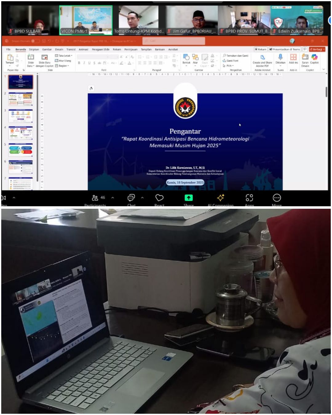 Mediatha.Com,Mamuju—Badan Penanggulangan Bencana Daerah (BPBD) Provinsi Sulawesi Barat melalui Kepala Bidang Kedaruratan dan Logistik, Arnidah, mengikuti rapat koordinasi secara virtual melalui Zoom Meeting yang diselenggarakan oleh Kementerian Koordinator Bidang Pembangunan Manusia dan Kebudayaan Republik Indonesia (Kemenko PMK), Kamis 18 September 2025.