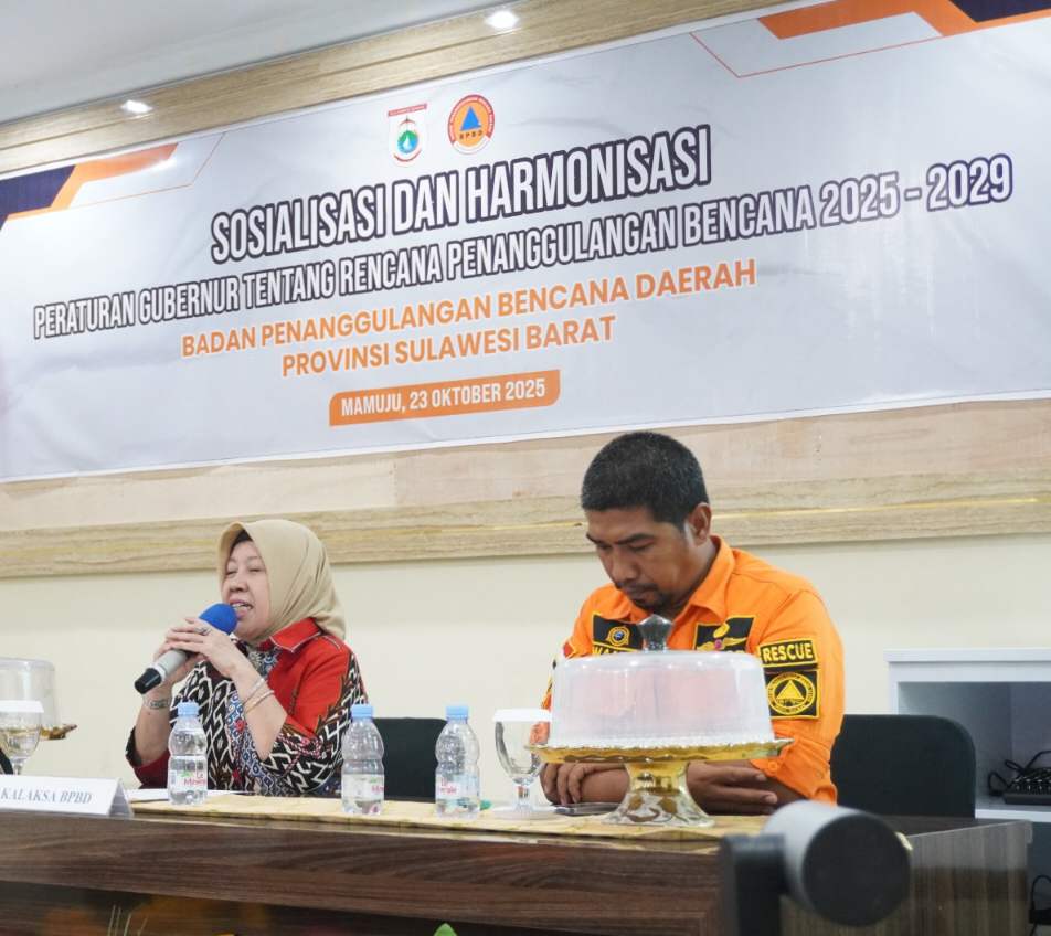 Mediatha.Com,Mamuju—Kepala Bidang Kedaruratan dan Logistik BPBD Provinsi Sulawesi Barat (Sulbar), Arnidah, memberikan masukan penting dalam kegiatan Sosialisasi dan Harmonisasi Peraturan Gubernur (Pergub) tentang Rencana Penanggulangan Bencana (RPB) Provinsi Sulawesi Barat Tahun 2025–2029, di Hotel Grand Putra Mamuju, Kamis 23 Oktober 2025.