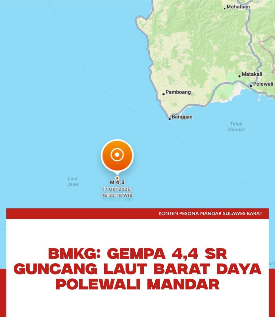 Mediatha.Com,Mamuju—Pusat Pengendalian Operasi (Pusdalops) Badan Penanggulangan Bencana Daerah (BPBD) Provinsi Sulawesi Barat menerima informasi dari BMKG Wilayah IV Makassar mengenai gempabumi tektonik berkekuatan Magnitudo 4.2 yang dirasakan di Kabupaten Polewali Mandar, Jumat 17 Oktober 2025, pukul 17.32 WITA.