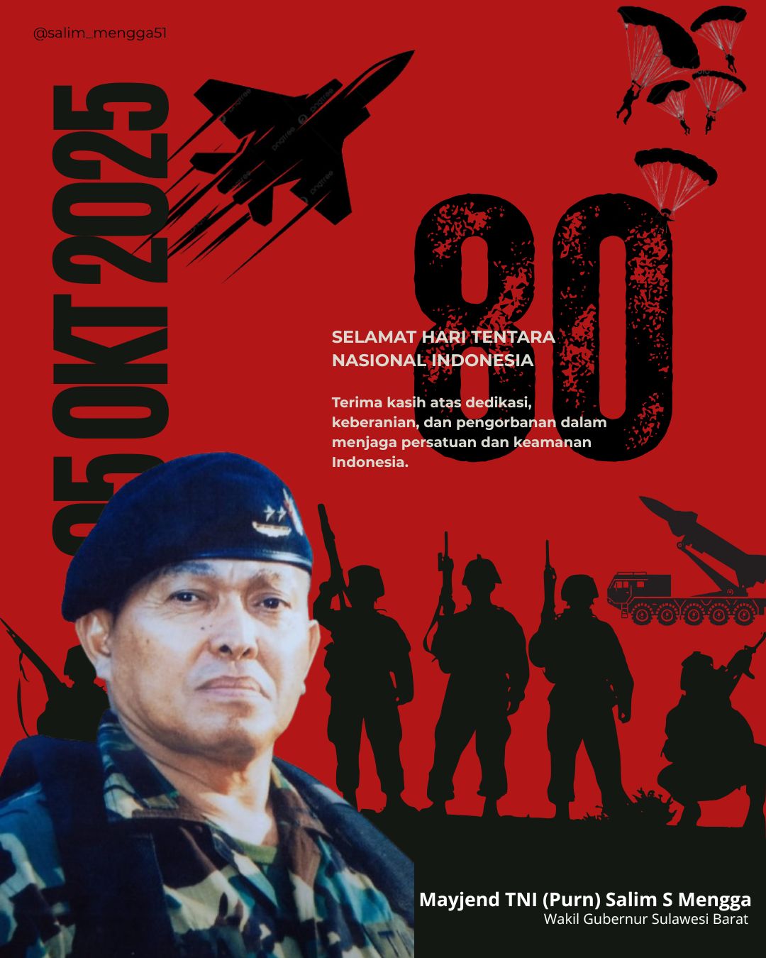 Mediatha.Com,Mamuju—Wakil Gubernur Sulawesi Barat, Mayjen TNI (Purn) Salim S Mengga, menyampaikan ucapan selamat dan apresiasi mendalam kepada seluruh prajurit Tentara Nasional Indonesia (TNI) yang merayakan Hari Ulang Tahun ke-80, Sabtu (5/10/2025).